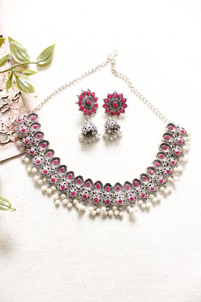 Pink Glass Stones Embedded Silver Finish Choker Style Necklace Set with Flower Jhumka Earrings is backordered and will ship as soon as it is back in stock.