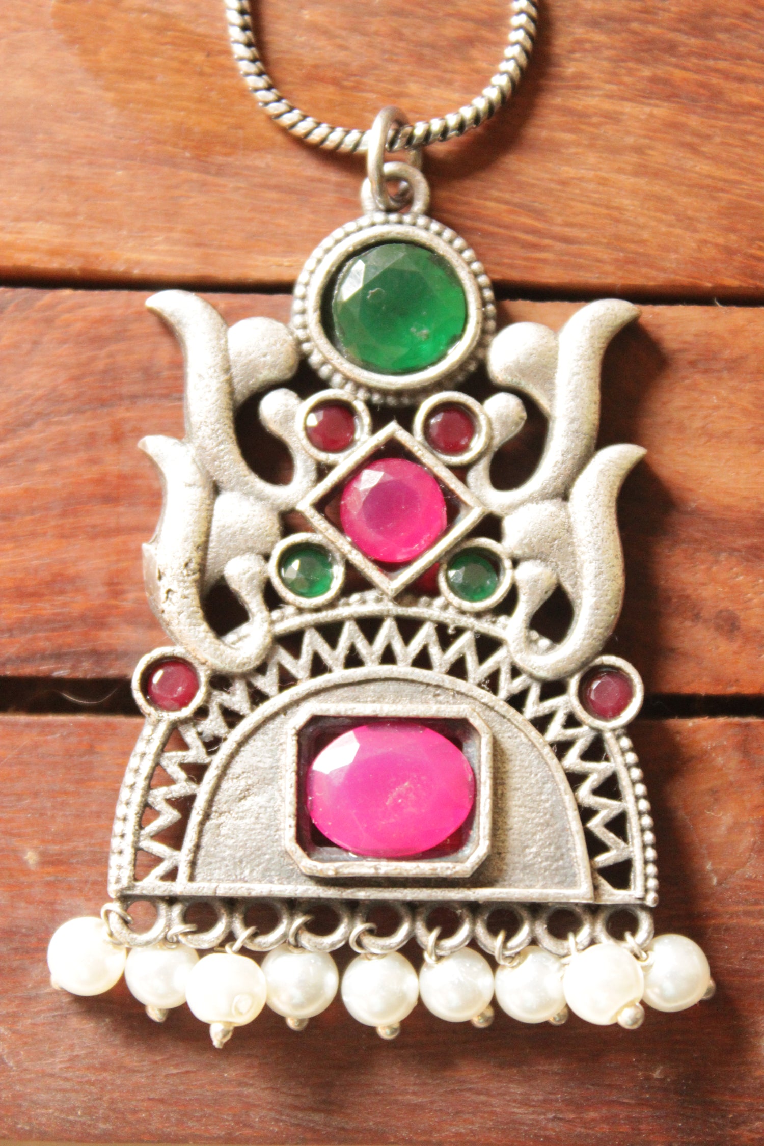 Premium Oxidised Finish Glass Stones & Pearl Embedded Pendant Chain Necklace