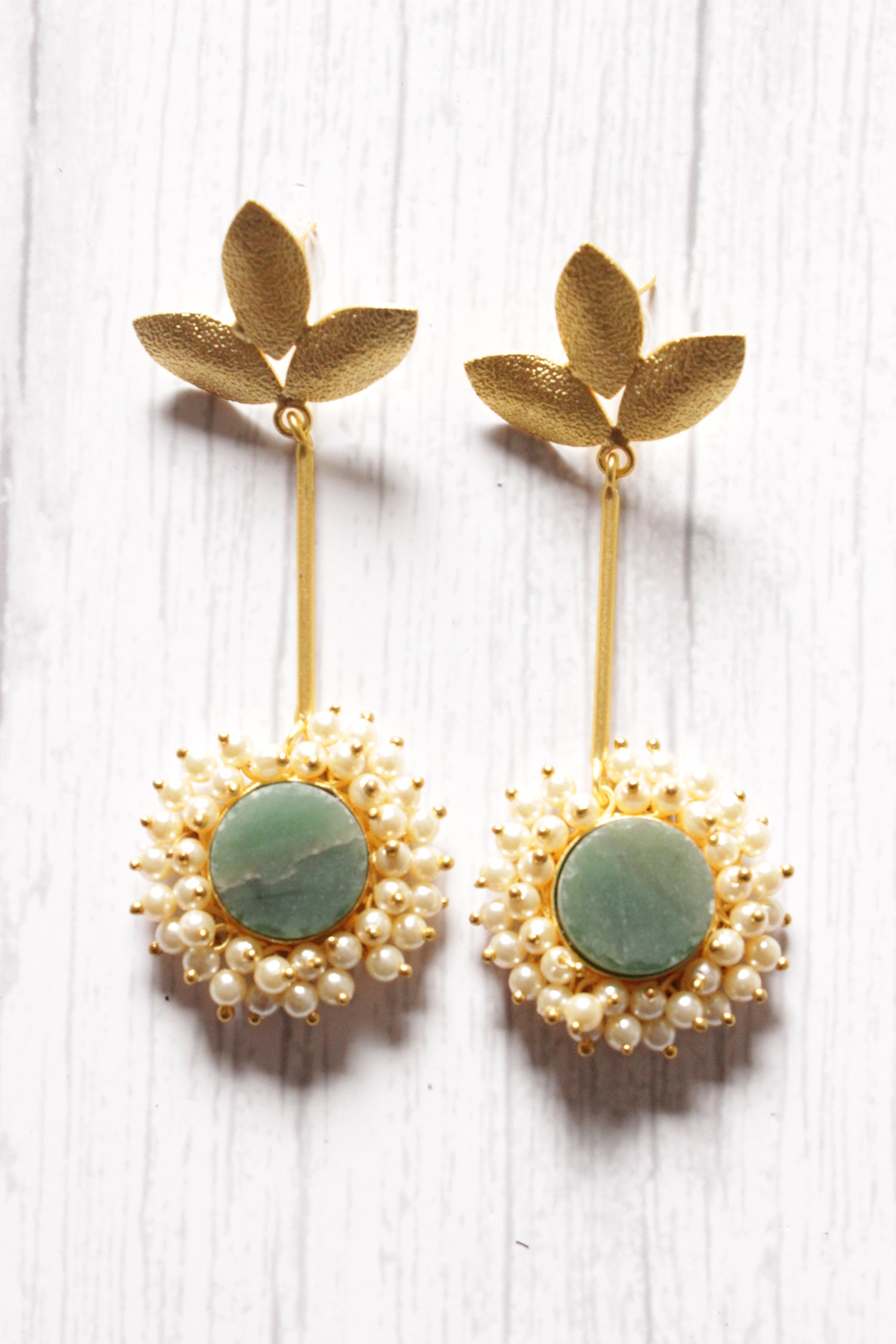Sea Blue Natural Stones Embedded Brass Dangler Earrings Embellished with White Beads