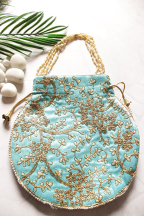 Sea Blue Velvet Fabric Hand Embroidered Gold Toned Potli
