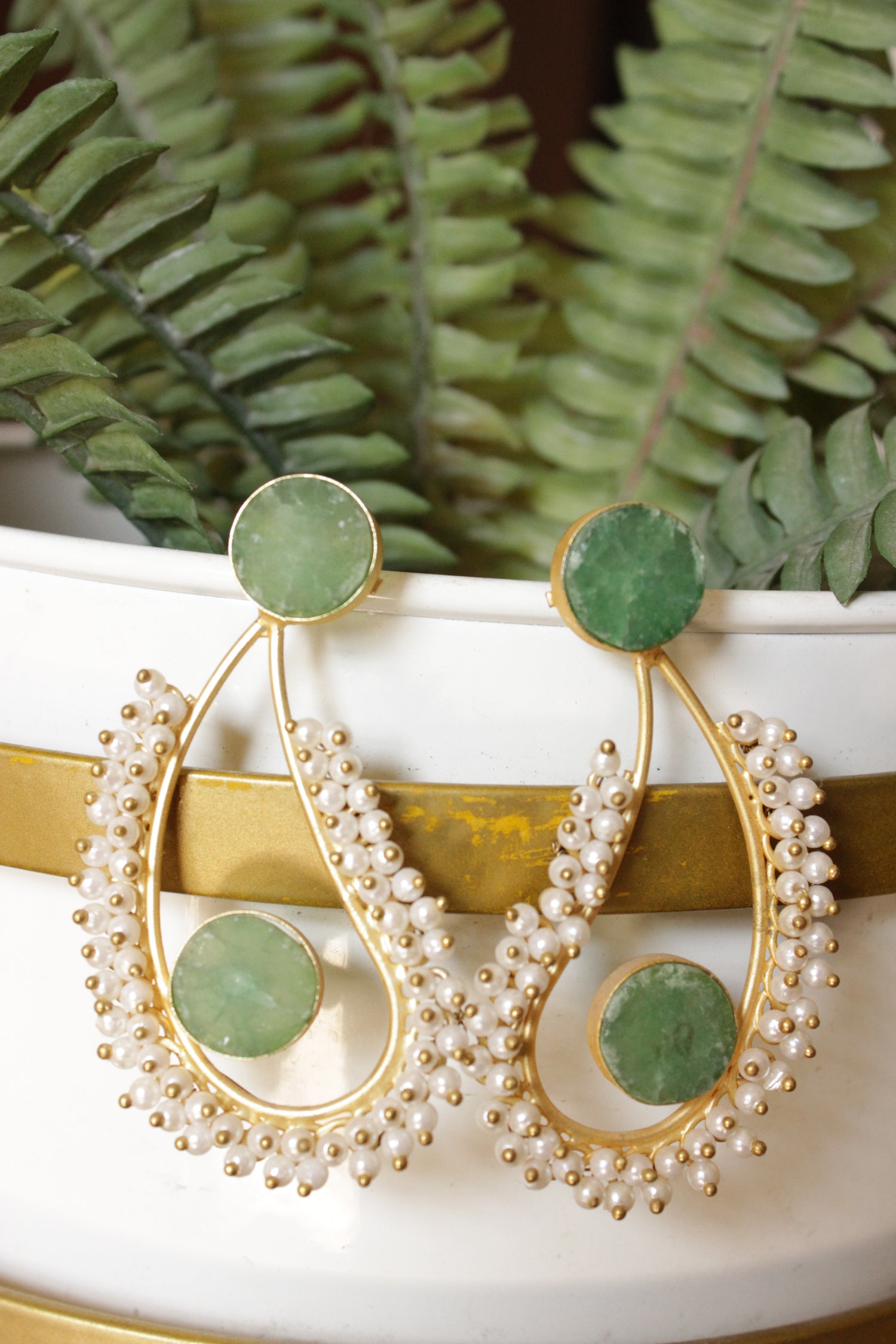 Sea Green Raw Natural Gemstones Embedded Gold Toned Brass Teardrop Shaped Earrings Accentuated with White Beads is backordered and will ship as soon as it is back in stock.