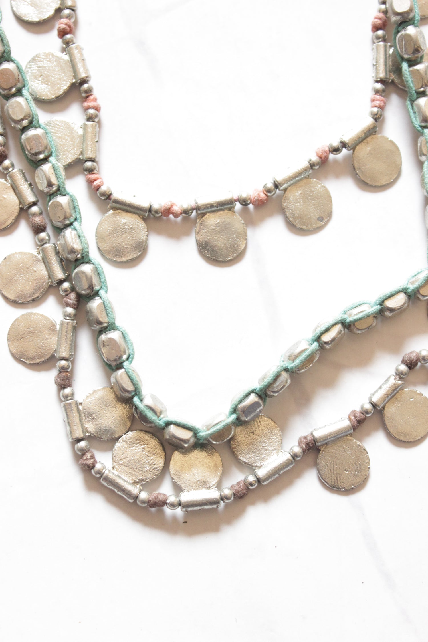Silver Finish Metal Charms Braided in Fabric Threads Necklace
