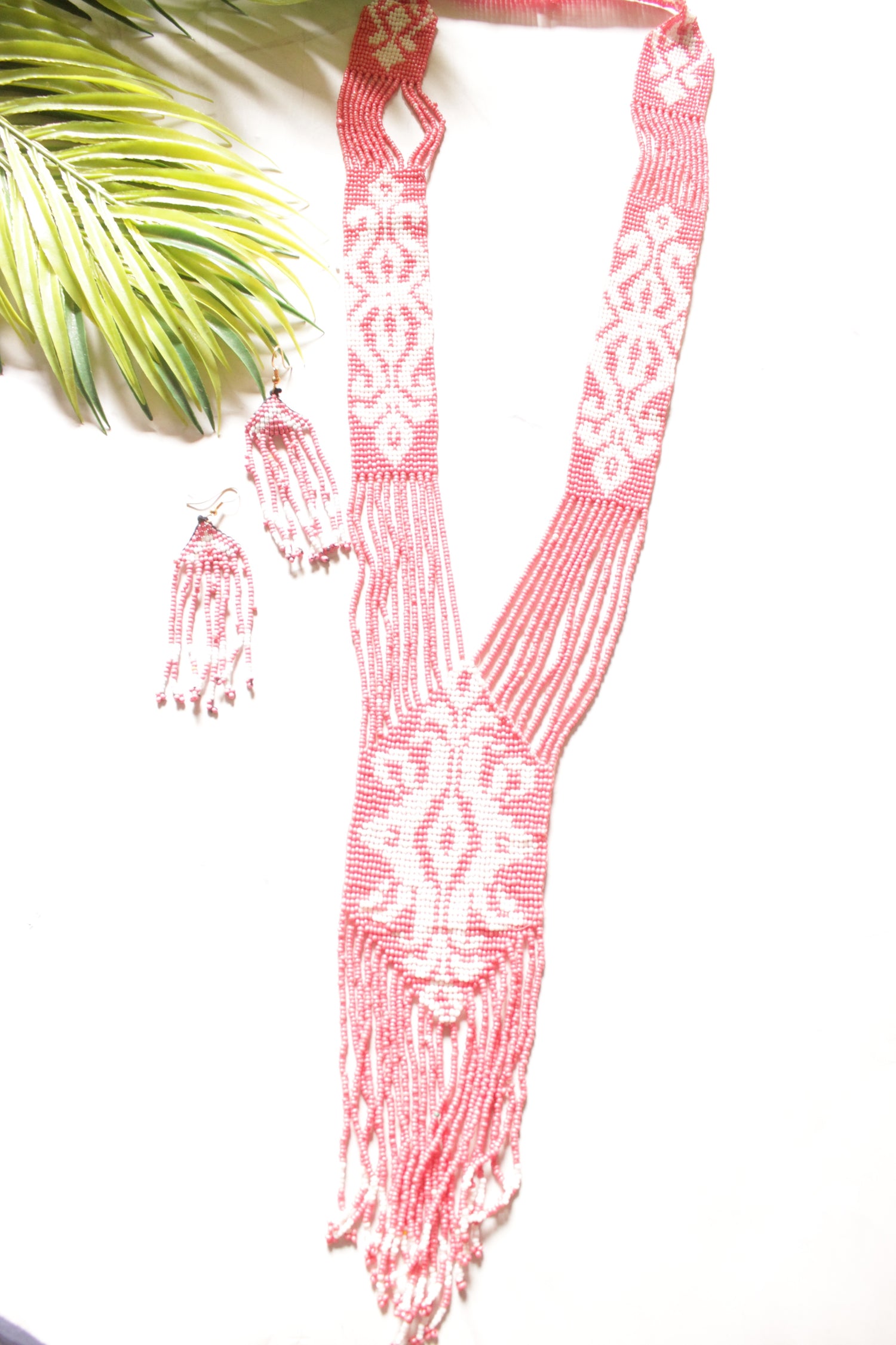 Subtle Red and Ivory Multi-Layer Hand Beaded Long Necklace Set