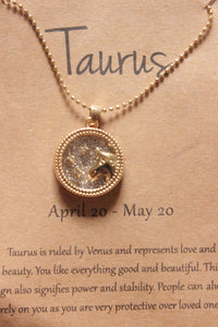 Taurus Sun Sign Gold Plated Day Style Round Resin Horoscope Astrology Minimalist Pendant Necklace with Card is backordered and will ship as soon as it is back in stock.