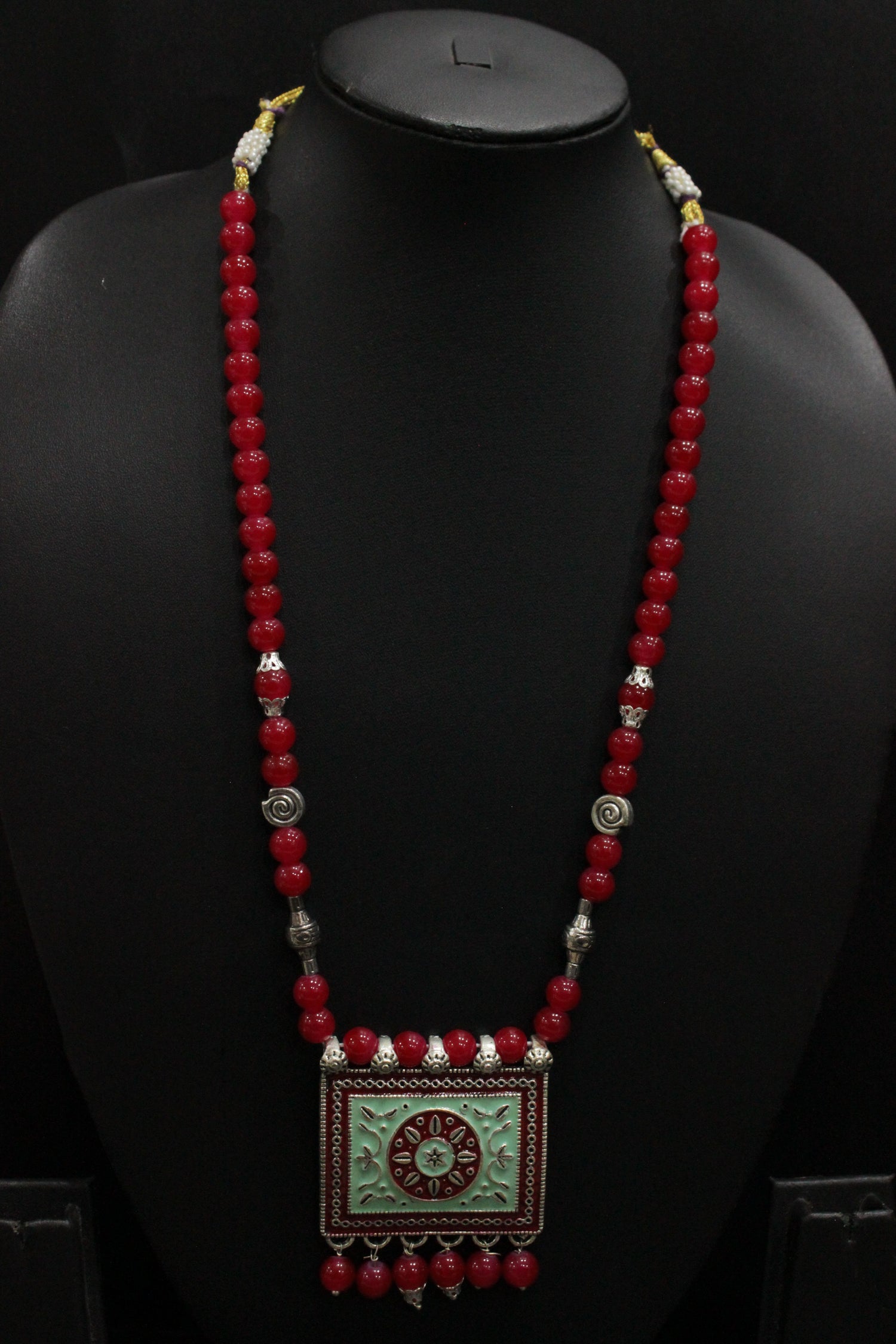 Turquoise and Red Meenakari Work Pendant Red Glass Beads Closure Necklace