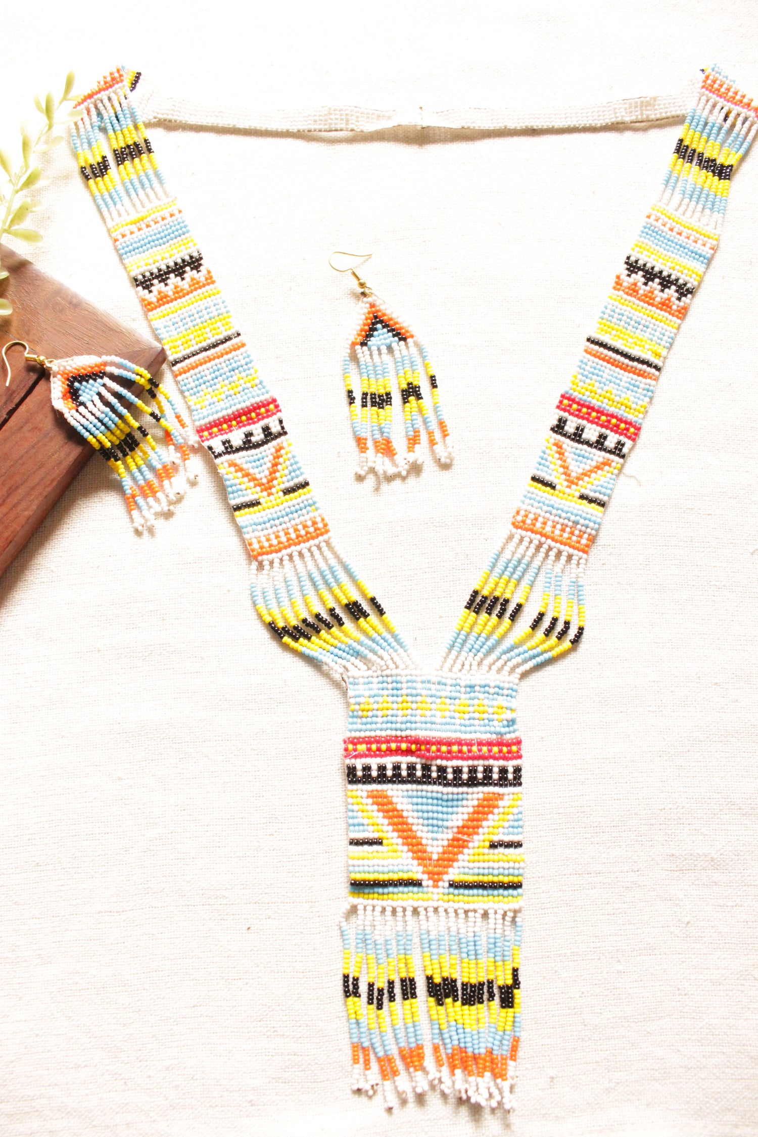 Vibrant Yellow and Multi-Color Geometric Motifs Handmade Beaded Long Necklace Set