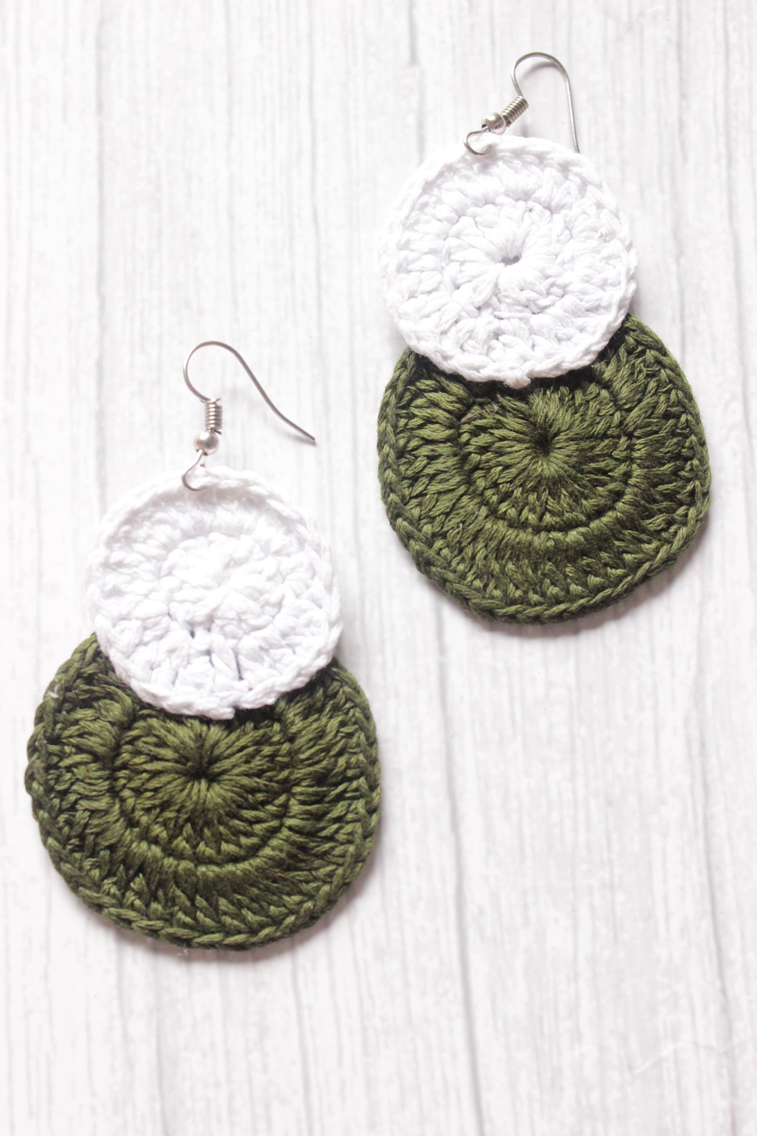 White and Mehendi Green Circular Crochet Hand Knitted Dangler Earrings