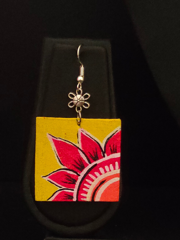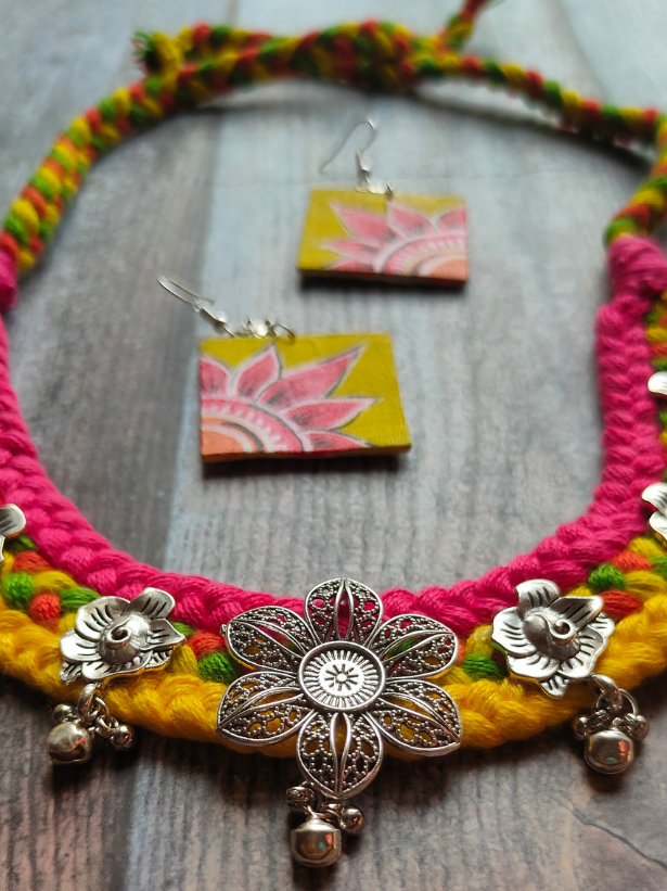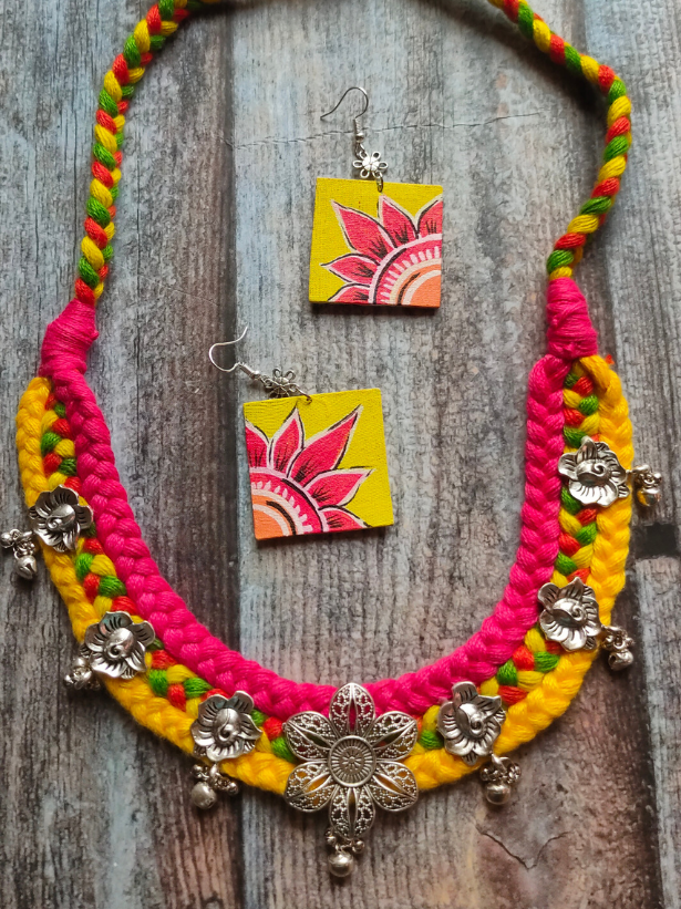 Yellow & Pink Braided Fabric Threads Necklace Set with Hand-Painted Earrings